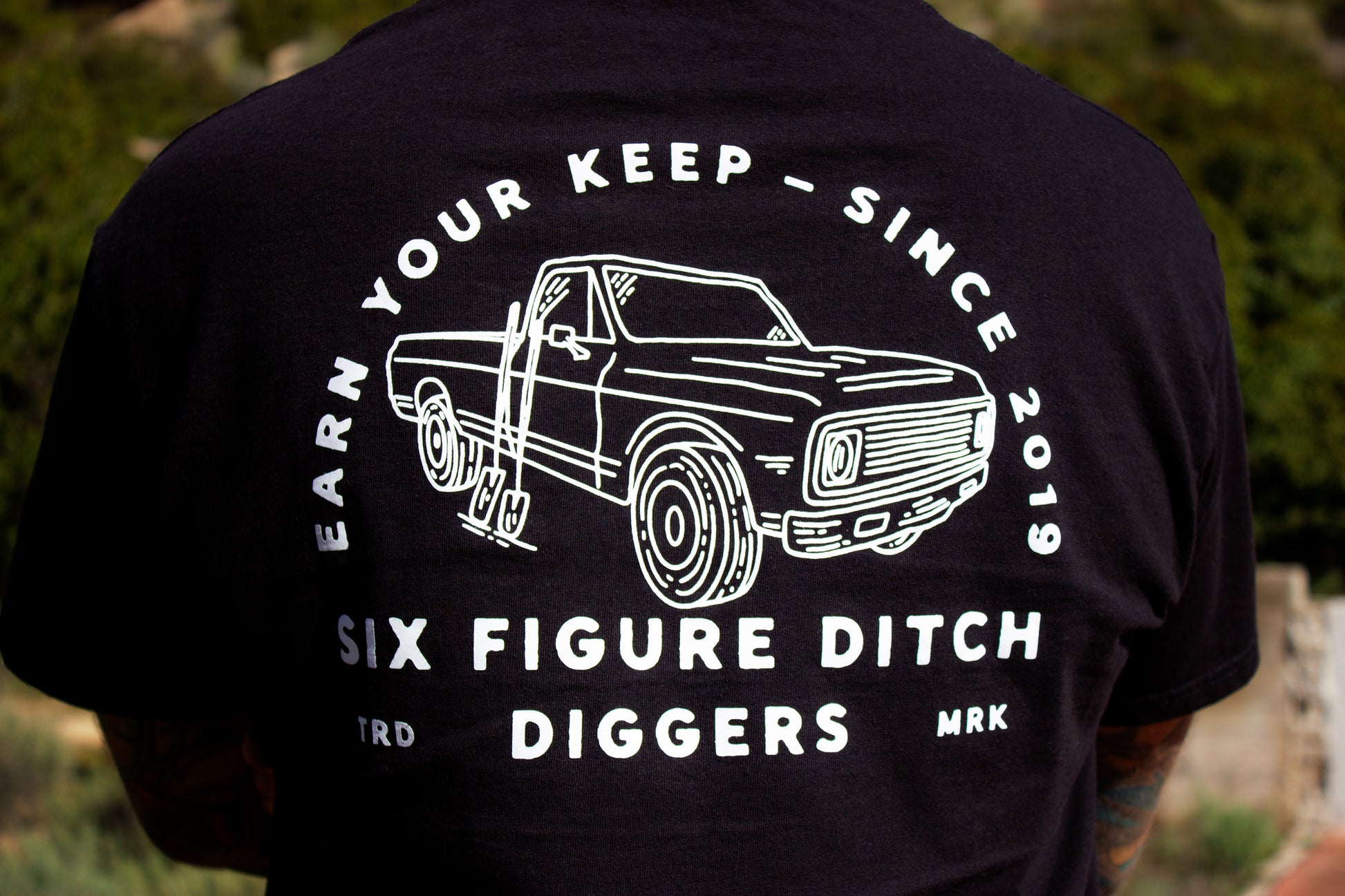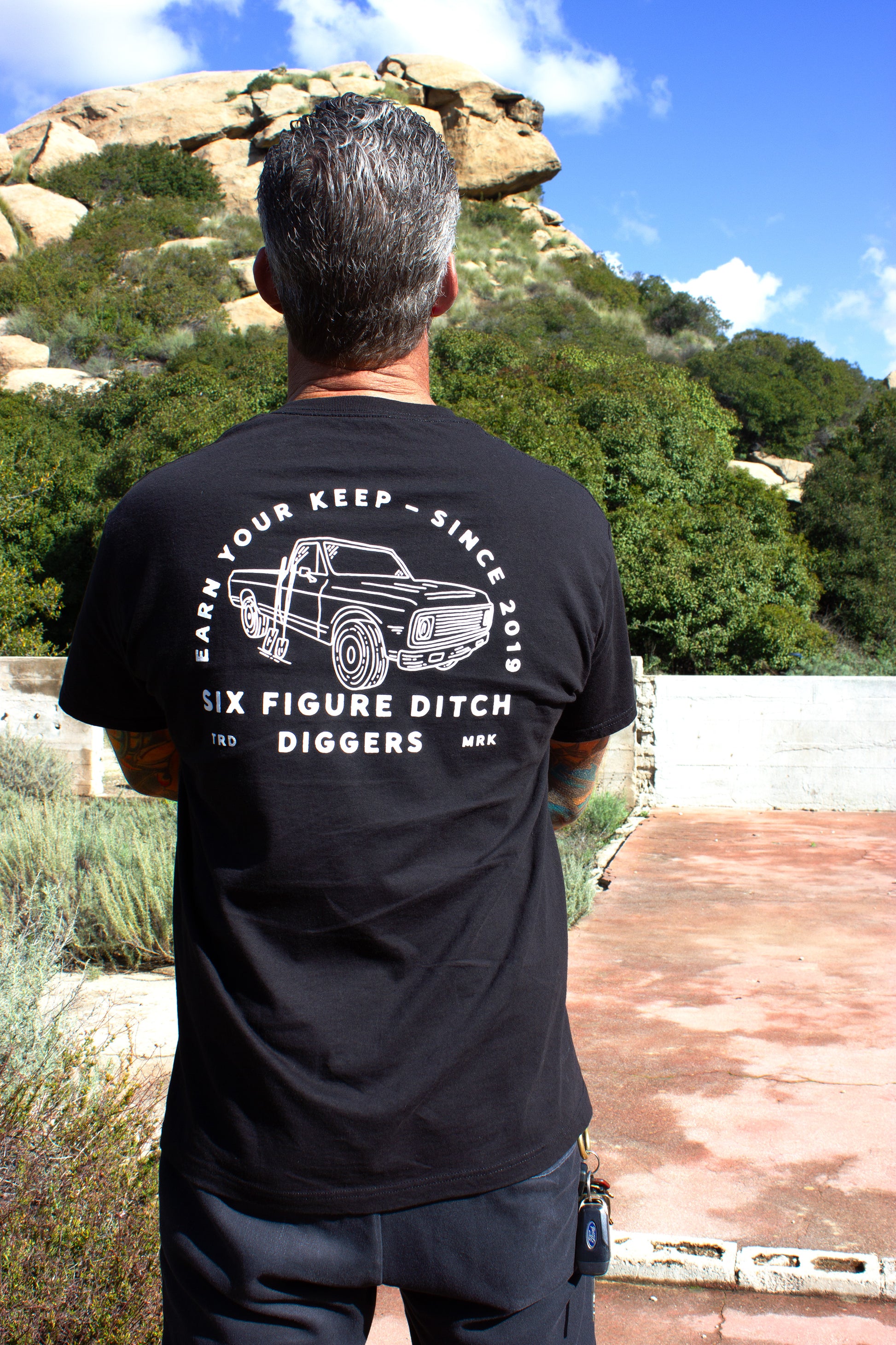 Earn Your Keep short sleeve Six Figure Ditch Diggers t-shirt with 1970s style truck design representing the simple and strong blue collar worker.